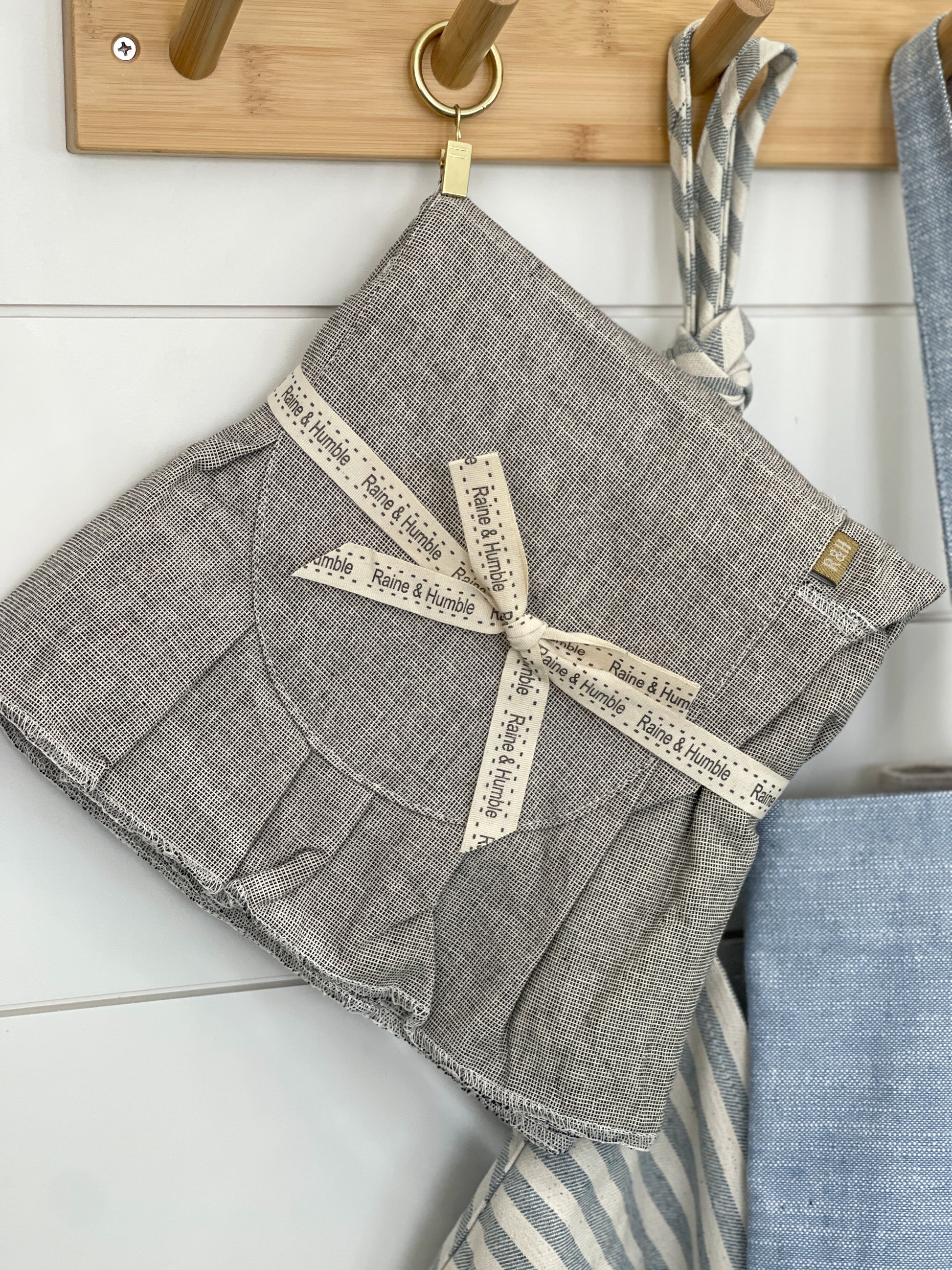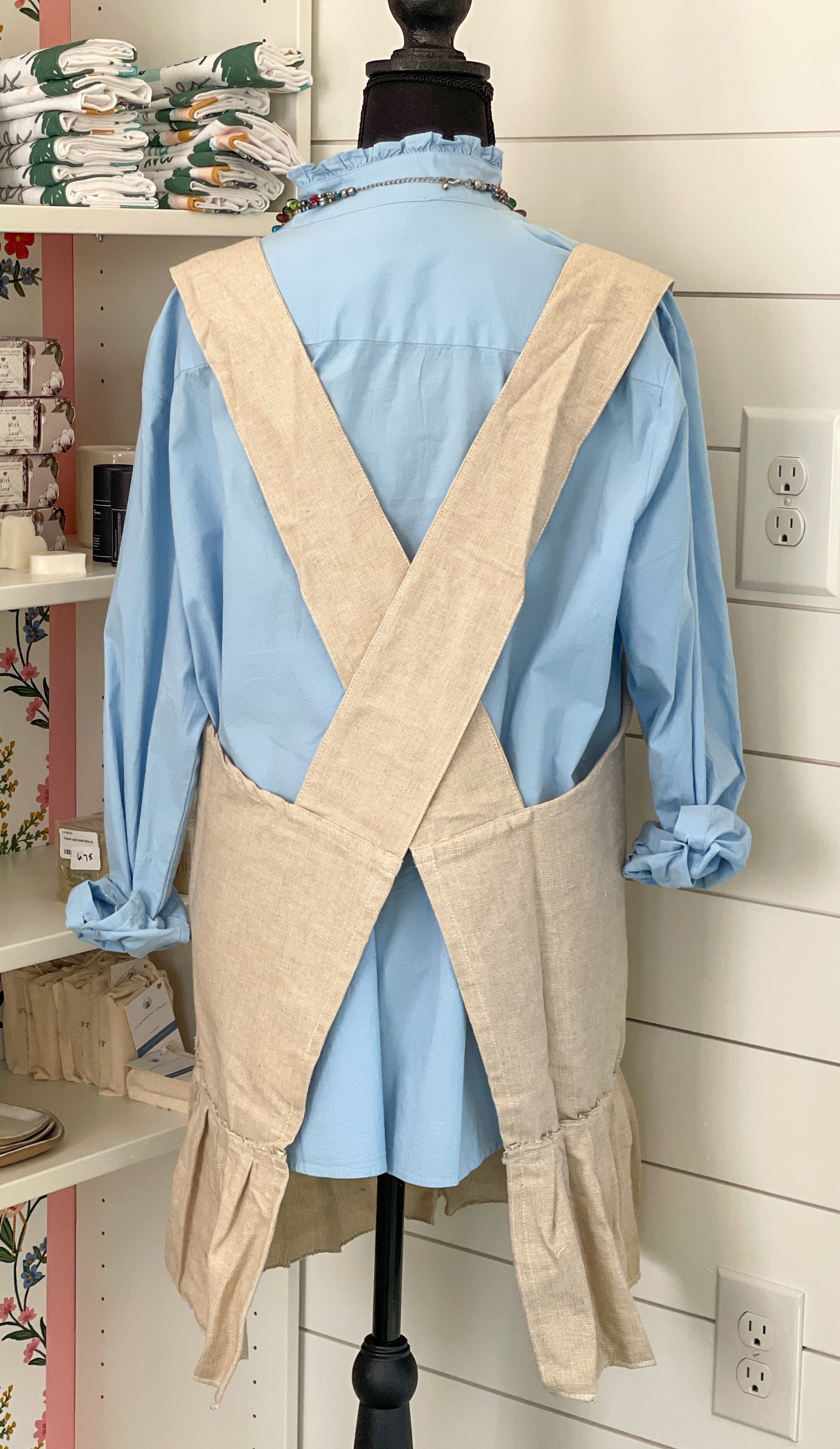 Soft Chambray 100% cotton slips on overhead, no fussy ties, handy front pocket.
