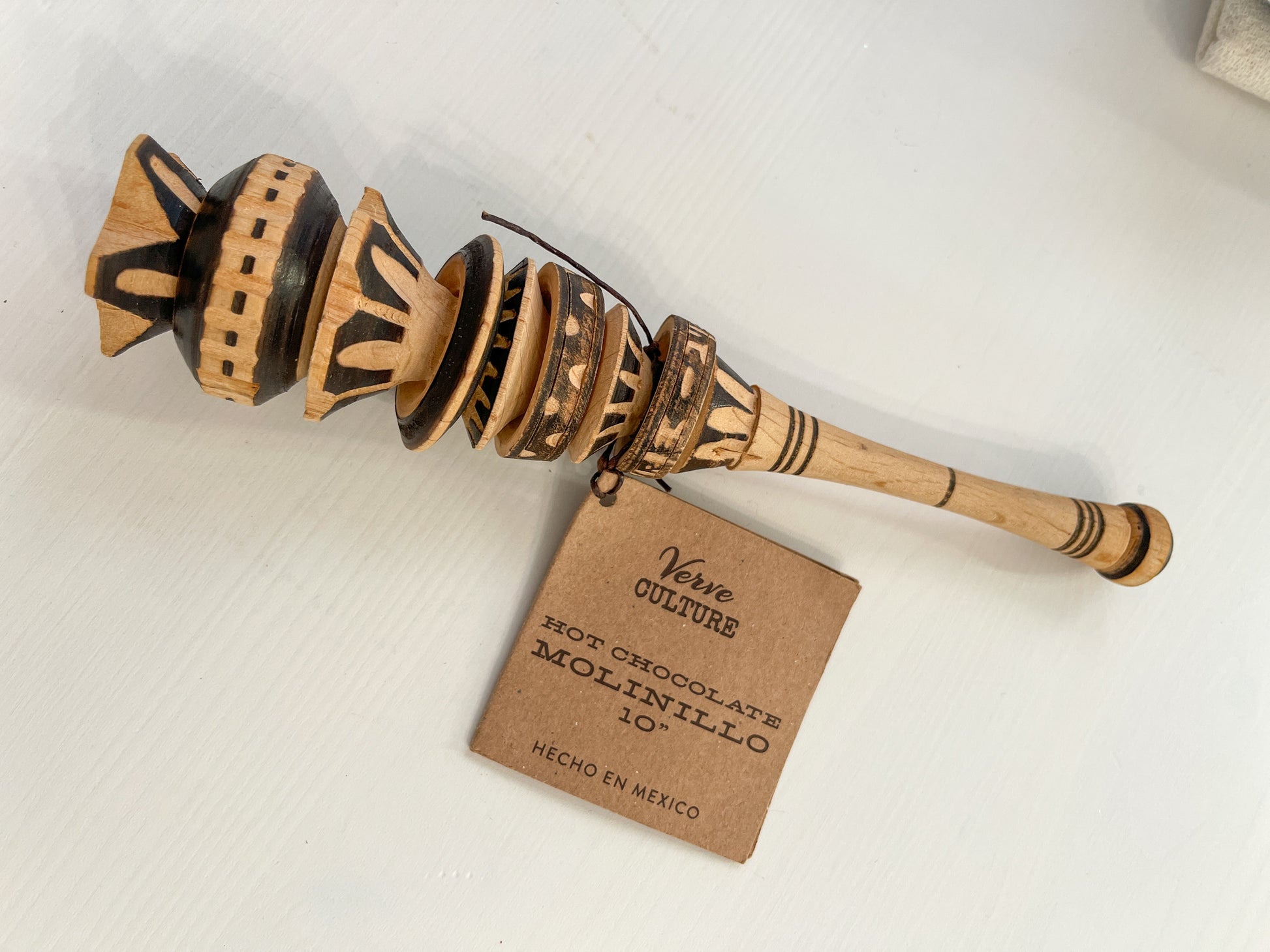 Traditional hand-carved wooden whisk from Mexico. Typically used by hand, on the stovetop, to froth hot chocolate by spinning it rapidly between the palms to create airy foam. It's an essential tool for a rich, authentic drink. Also ideal for muddling herbs and fruits for drinks.
