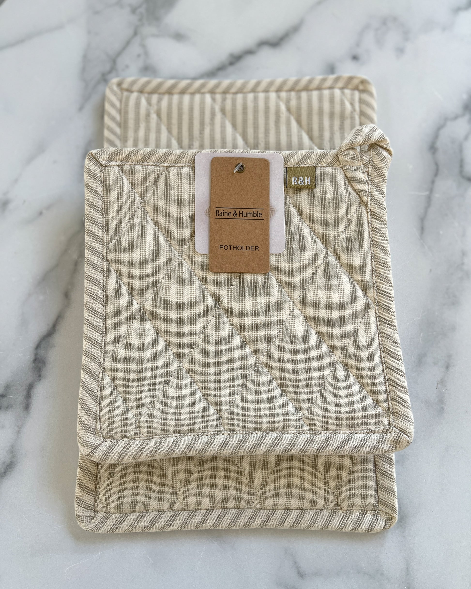 Diamond quilted pattern offers heat protection, made from crafted yarn-dyed Manor striped fabric.